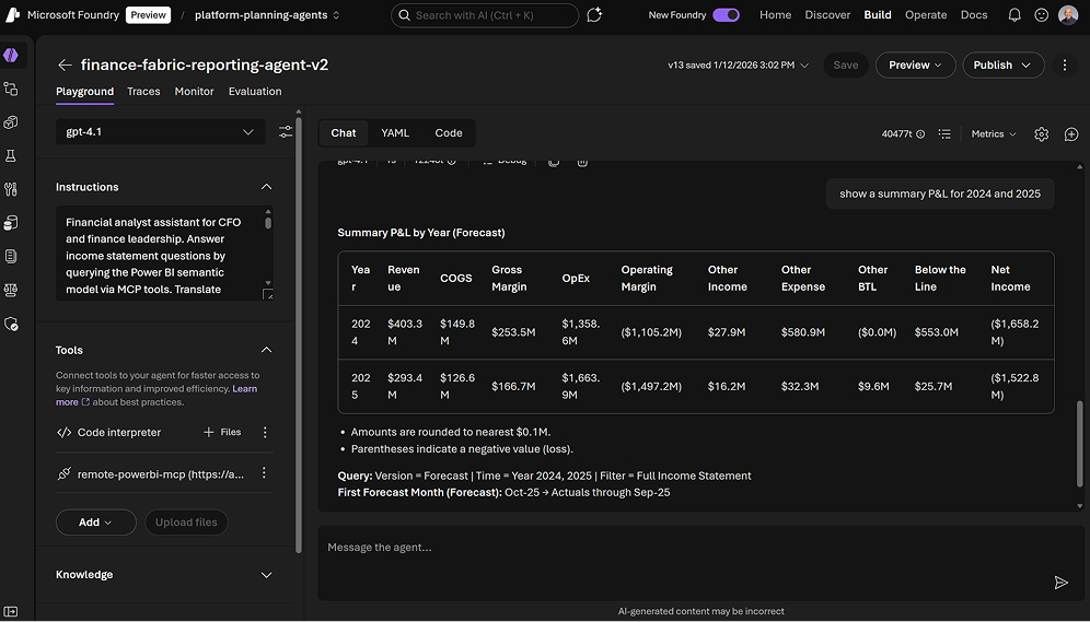 For more sophisticated, high-volume, or consistent forecasting use cases such as workforce planning or demand forecasting, full-code models can be built in SQL or Python in Fabric and connected to ML models if needed. SQL and Python are much more accessible now with LLM-assisted coding.